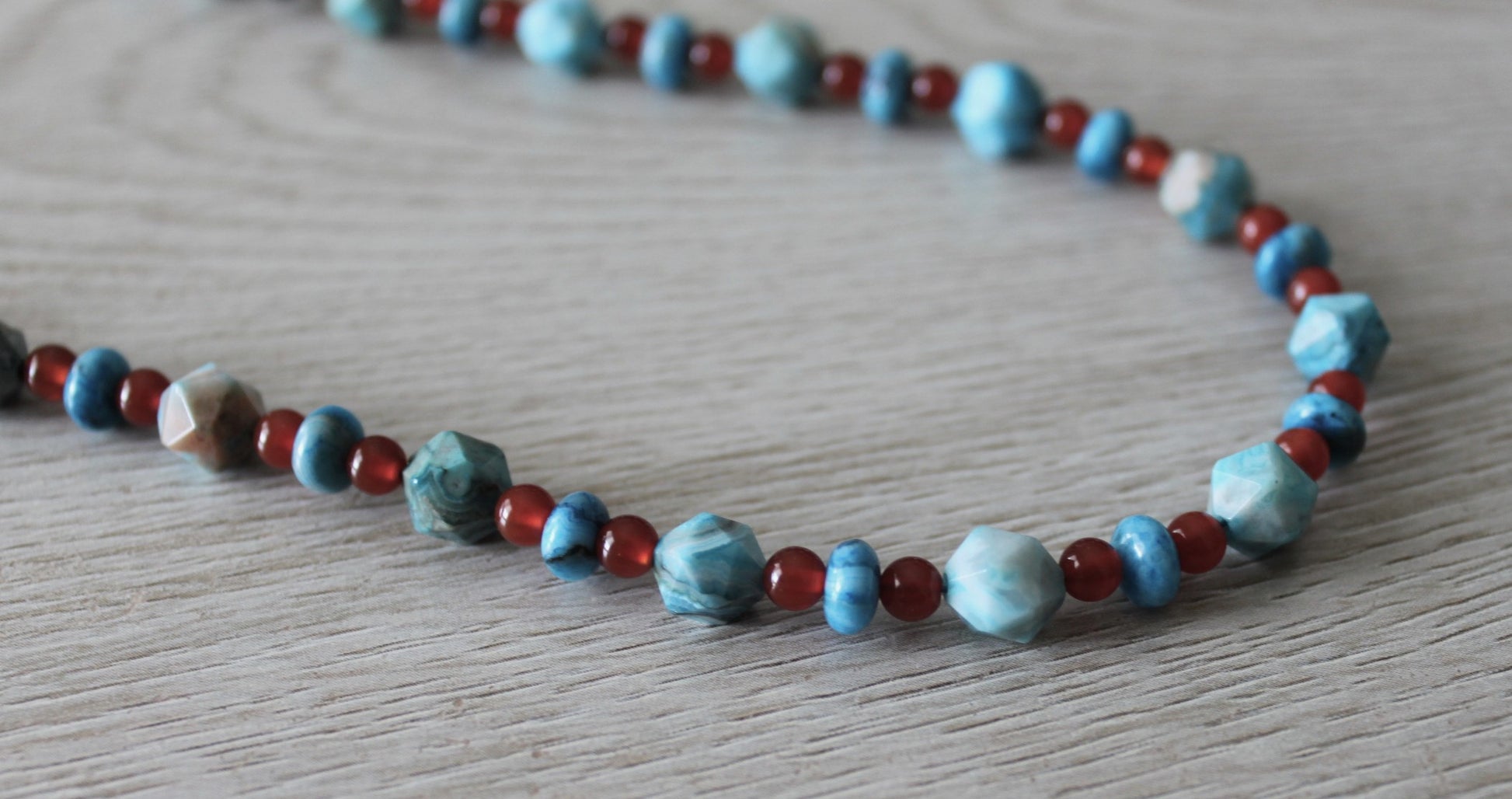 Blue Crazy Lace Agate Star Cut beads and rondelles. Carnelian round beads. Lobster Clasp 19"
