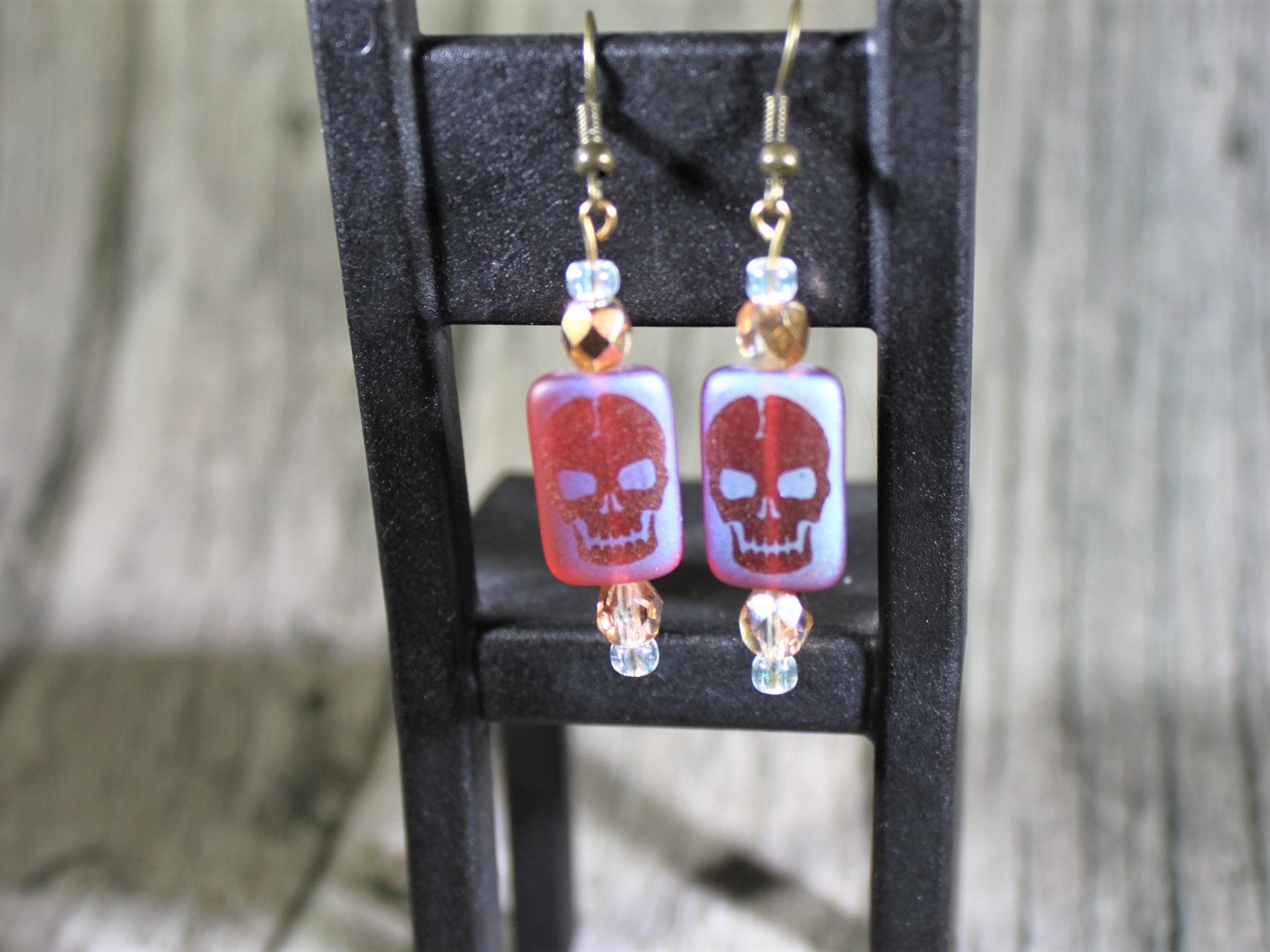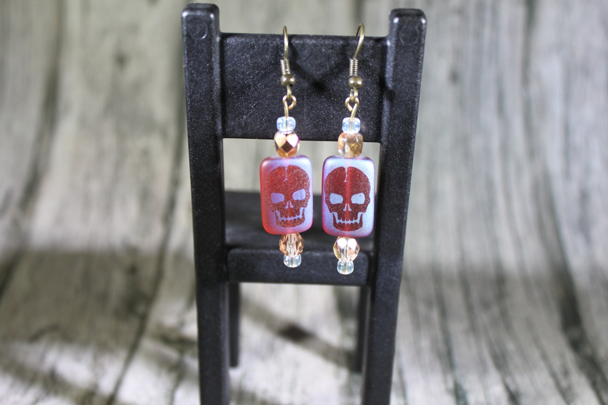 Czech Glass Skull image in metallic. Bronze Ear Wire