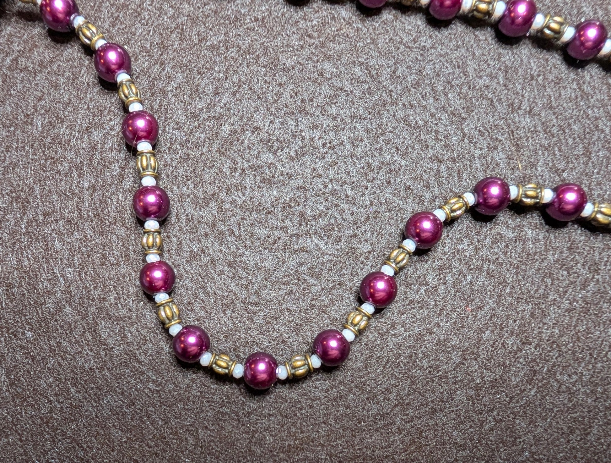 Glass Pearls in Deep Magenta (8mm). Pink crystals. Bronze metal beads. Toggle Clasp. 18"